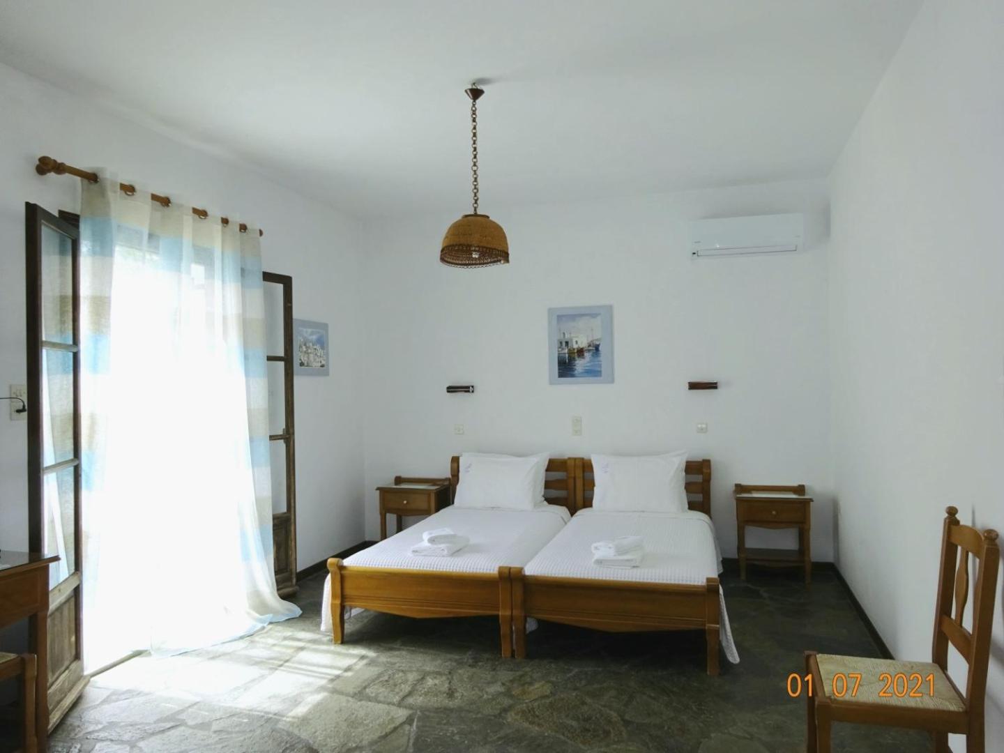Upon arriving at Alkionides Bungalows, you are greeted by the serene atmosphere of the garden, surrounded by the distinctive white-washed architecture of the Cycladic style. The air is filled with the gentle scent of blooming flowers as you settle into your air-conditioned apartment, complete with a terrace offering views of the Aegean Sea. Mornings are peaceful, with the sound of birds chirping and the sun rising over the garden, inviting you to enjoy breakfast outside. A short stroll takes you to Mikro Piperi Beach, where you can feel the soft sand beneath your feet and the refreshing sea breeze on your face.