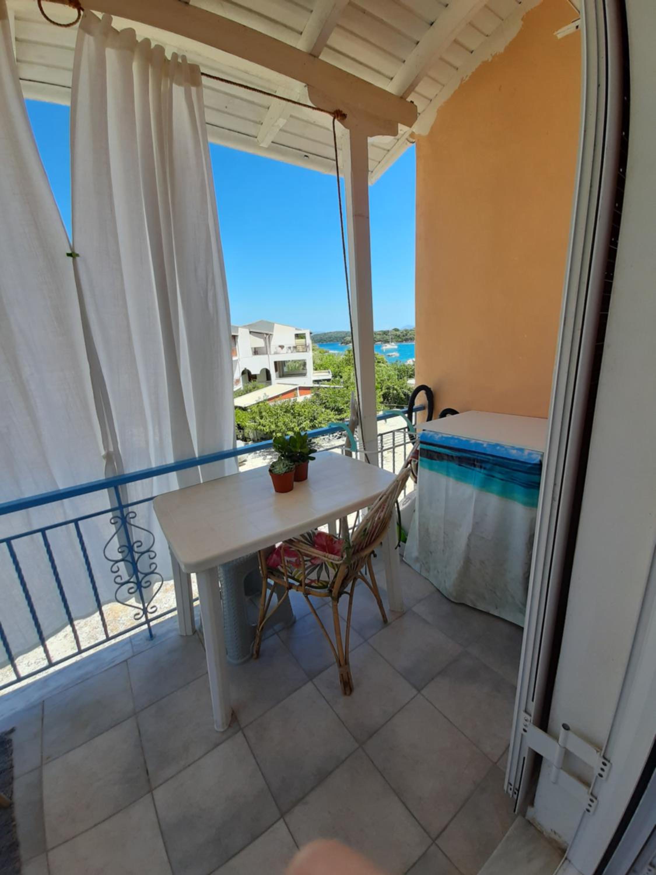 Upon arrival, the warm sea breeze greets you as you step into the air-conditioned apartment, where the flat-screen TV and modern decor provide a cozy atmosphere. The area feels relaxed, with the sound of waves lapping at the shore just outside your window. A short stroll leads you to Nidri Beach, where you can enjoy the sun or explore local eateries. Mornings are peaceful, with the terrace offering a perfect spot for coffee while taking in the breathtaking views.