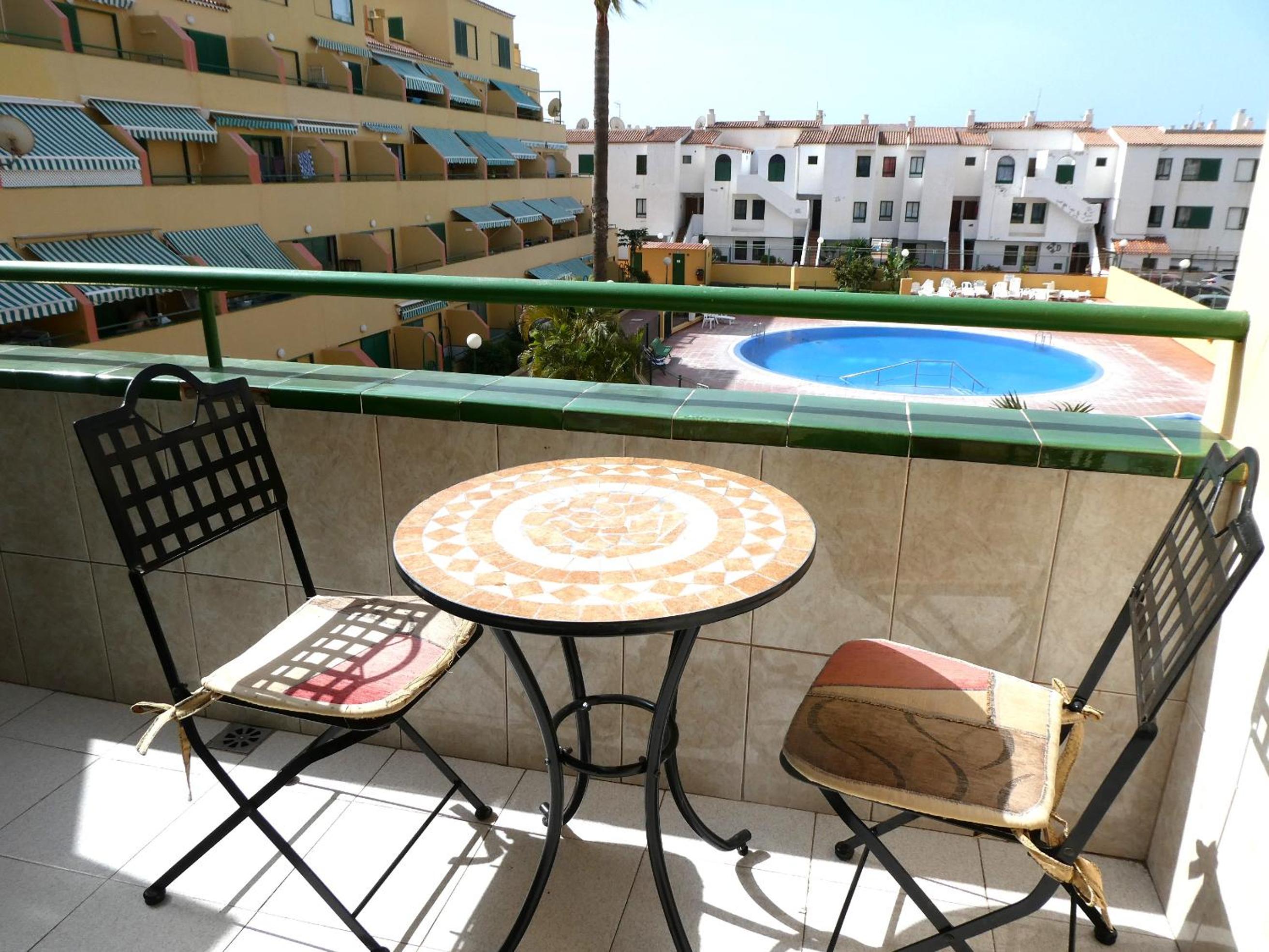 Enjoy a comfortable stay in our apartment equipped with a fully equipped kitchen, terrace with pool views, and a balcony for outdoor dining.